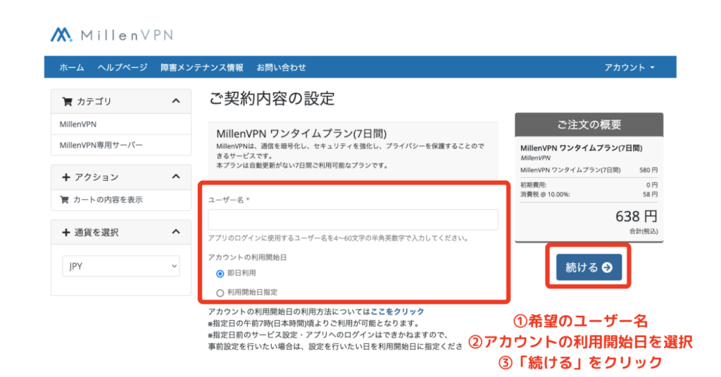 - ①Millen VPN公式サイトで「今すぐお申し込み」をクリック