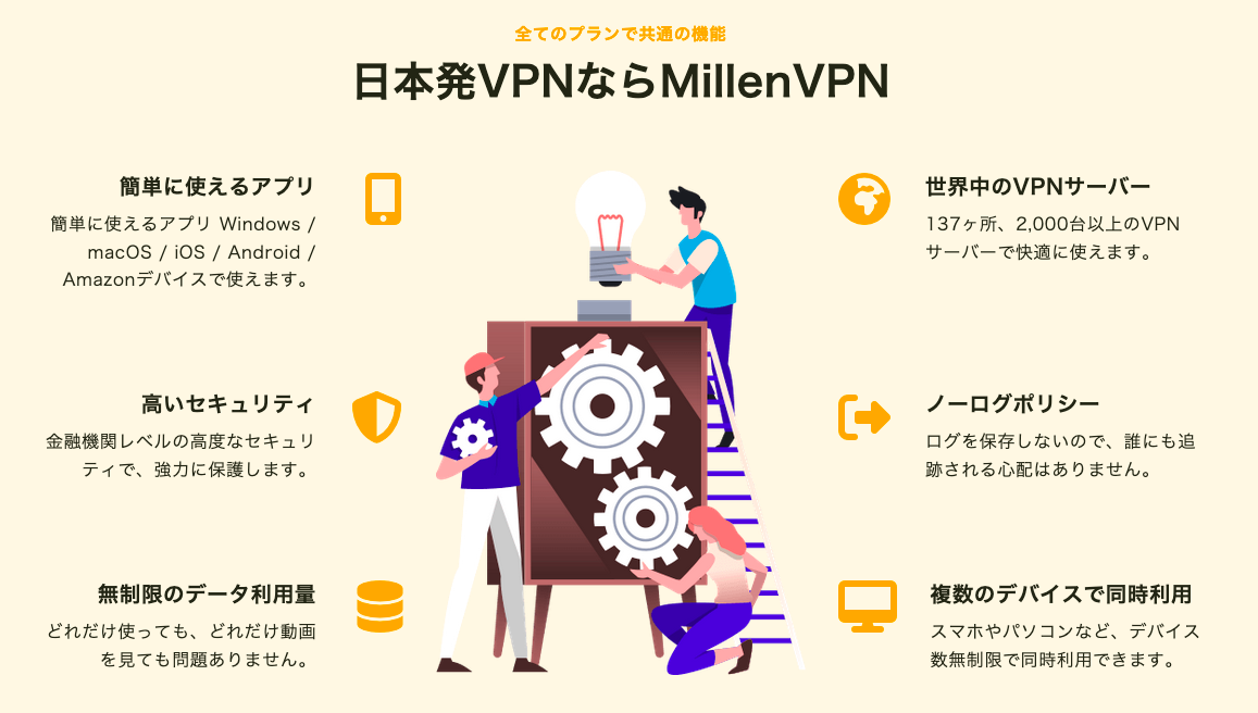 MillenVPNは、リーズナブルな価格にもかかわらず、高いセキュリティとノーログポリシーで、安全にインターネットを使えるVPNサービスです。1つのアカウントで無制限のデバイスに接続でき、スマホやPCなど複数の端末を同時に保護できます。