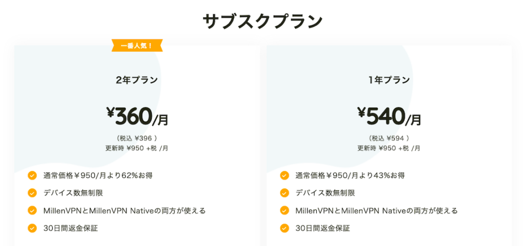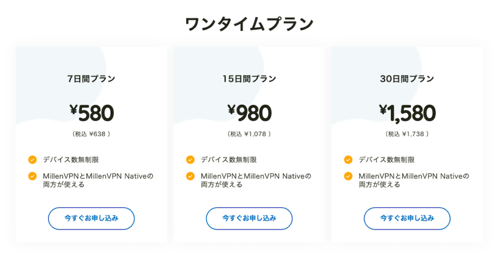 MillenVPNは、利用期間に応じて以下の料金プランを提供しています。
